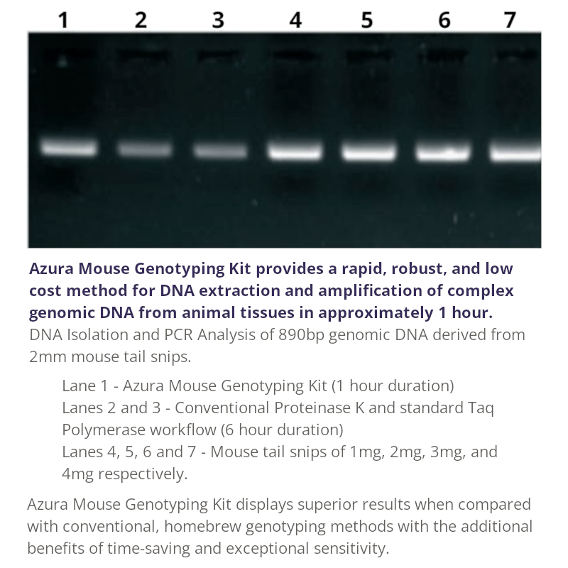Azura™ Mouse Genotyping Kit provides a rapid, low-cost and highly efficient method for the DNA extraction and amplification of a variety of solid tissue types, and is ideally suited to mouse tail snips and mouse ear punches. Conventional methods require laborious, time-consuming and inefficient steps such as phenol extractions and overnight incubations.