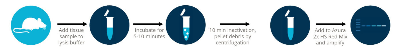Azura™ Mouse Genotyping Kit includes a proprietary lysis buffer formulation which delivers a rapid and complete release of genomic DNA in 15 minutes, followed by PCR amplification using Azura 2x HS Red Mix for unrivalled sensitivity and performance regardless of sequence complexity. Azura 2x HS Red Mix also includes an inert red dye which facilitates direct gel-loading.