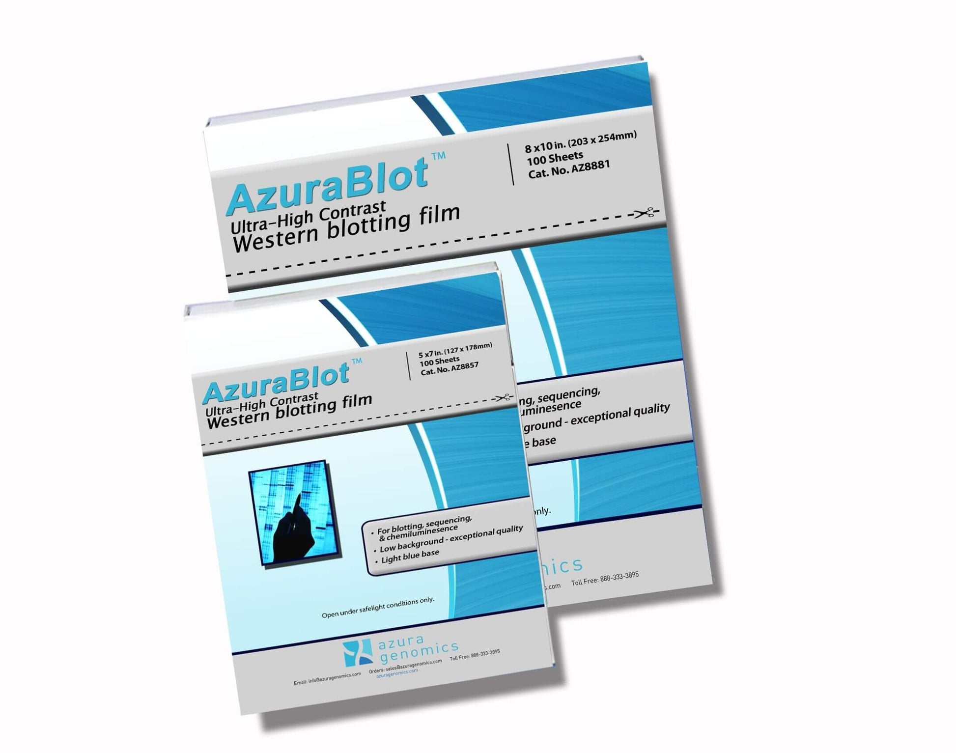 AzuraBlot™ film is specially formulated for an optimized balance of high sensitivity and low background. This low background, high contrast formula produces a lighter blue film, making it ideal for all autoradiographic and electrophoretic applications. AzuraBlot™is also coated on both sides (double emulsion) for improved consistency and overall performance.