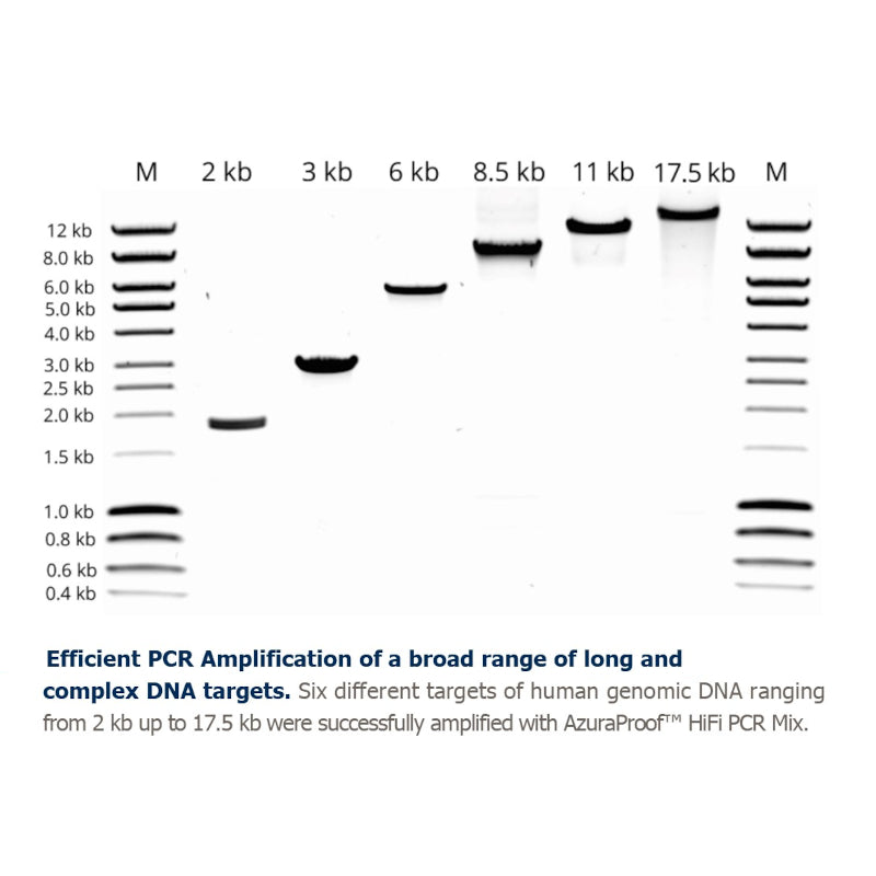 AzuraProof™ HiFi PCR Mix provides greater yields with less optimization than other 2x master-mixes, even in amplification of GC-rich targets, DNA of sub-optimal purity, and long templates. AzuraProof™ HiFi PCR Mix has a high elongation rate of 10 sec/kb, which is 4x faster than Taq.