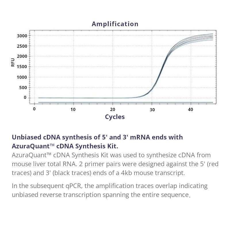 The AzuraQuant™ cDNA Synthesis Kit is supplied with a high-performance 5x buffer system including an optimized ratio of random hexamer primers and anchored oligo (dT) primers which delivers unbiased, efficient and sensitive cDNA synthesis. The AzuraQuant™ cDNA Synthesis Kit delivers both highly efficient first-strand synthesis and higher cDNA yields, leading to enhanced reproducibility and data accuracy. The AzuraQuant™ cDNA Synthesis Kit provides an ideal chemistry for success with limited starting material, such as tissue biopsies.