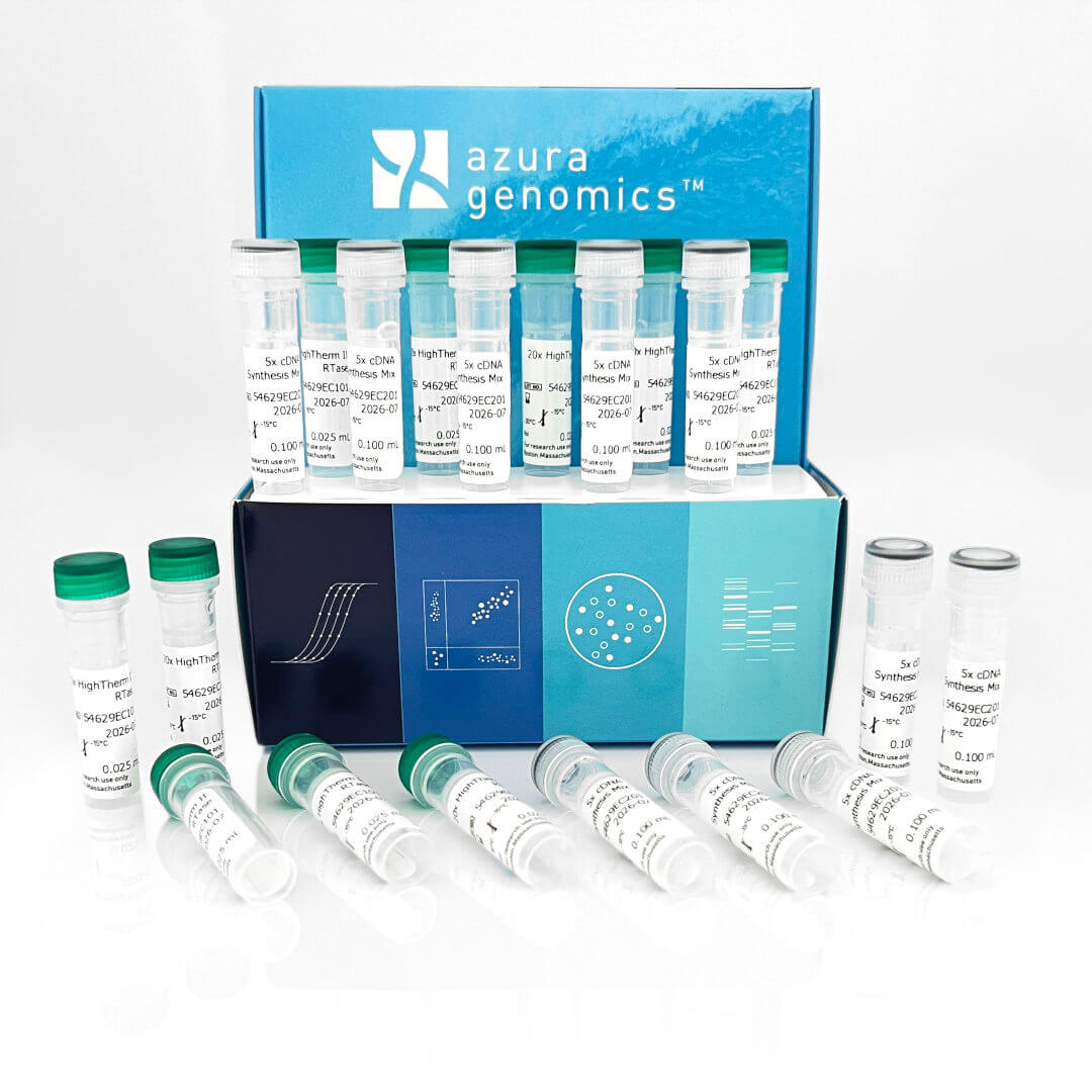 The AzuraQuant™ II cDNA Synthesis Kit is supplied with a high-performance 5x cDNA synthesis mix including an optimized ratio of random hexamer primers and anchored oligo (dT) primers, which delivers excellent consistency. The AzuraQuant™ II cDNA Synthesis Kit delivers both highly efficient first-strand synthesis and higher cDNA yields, leading to enhanced reproducibility and data accuracy. The kit is supplied in a convenient 2-tube format comprised of a 5x cDNA synthesis mix and 20x HighTherm™ II reverse transcriptase blended with RNase inhibitor. HighTherm™ II reverse transcriptase exhibits enhanced thermostability and processivity, low RNase H activity, and robust overall performance in cDNA synthesis.