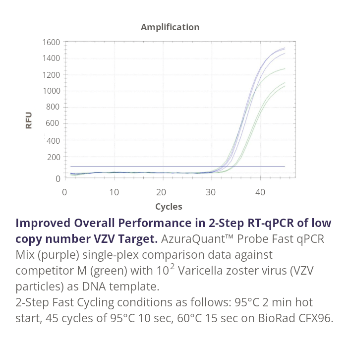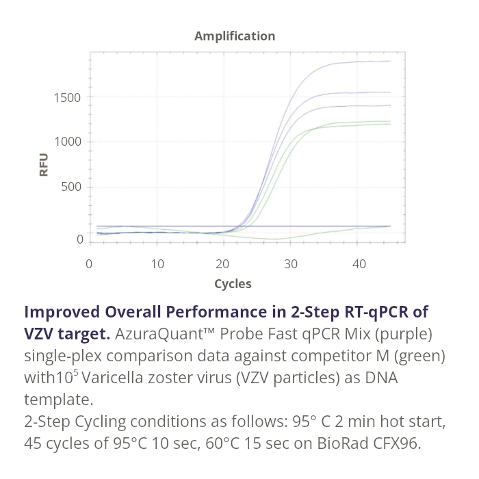 The AzuraQuant™ Probe Fast qPCR Mix is comprised of Azura HS Taq DNA Polymerase and an optimized buffer chemistry providing robust real-time PCR and broad range detection for increased sensitivity, speed, and reproducibility. In addition, the 2x master-mix exhibits excellent sensitivity in complex multiplex reactions, in which multiple amplicons can be detected without a loss in efficiency. The AzuraQuant™ Probe Fast qPCR Mix requires little if any optimization and can be used to quantify any DNA templates including cDNA, genomic DNA, and low copy number viral sequences while providing resistance to many PCR inhibitors. The AzuraQuant™ Probe Fast qPCR Mix also combines rapid antibody-mediated hot-start activation and processive enzyme chemistry, making it compatible with both standard and fast instrument cycling programs.