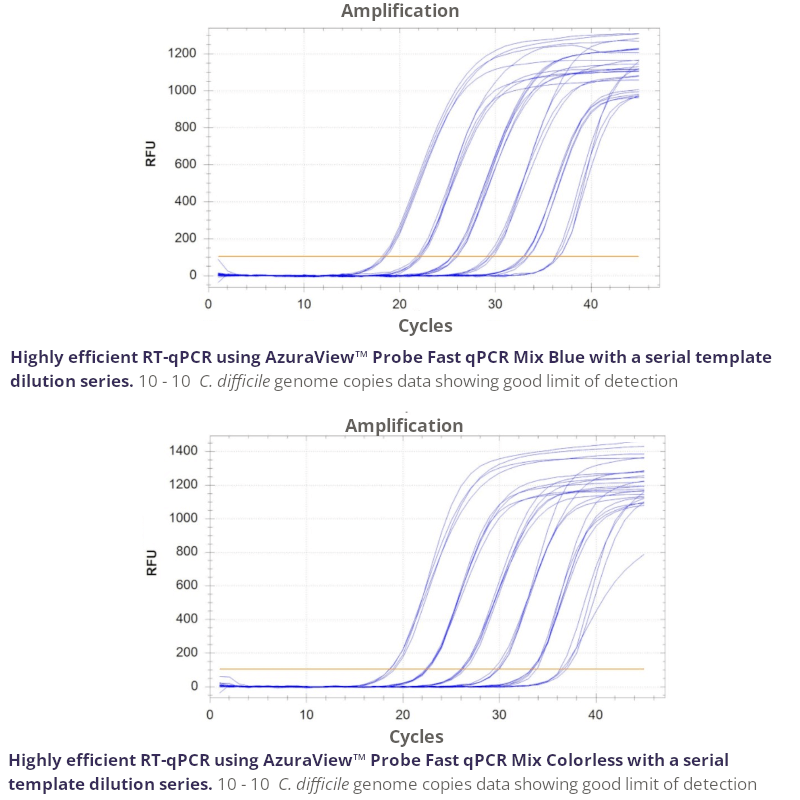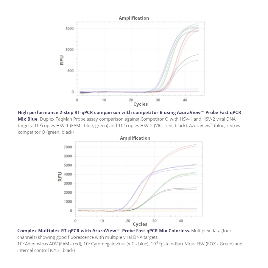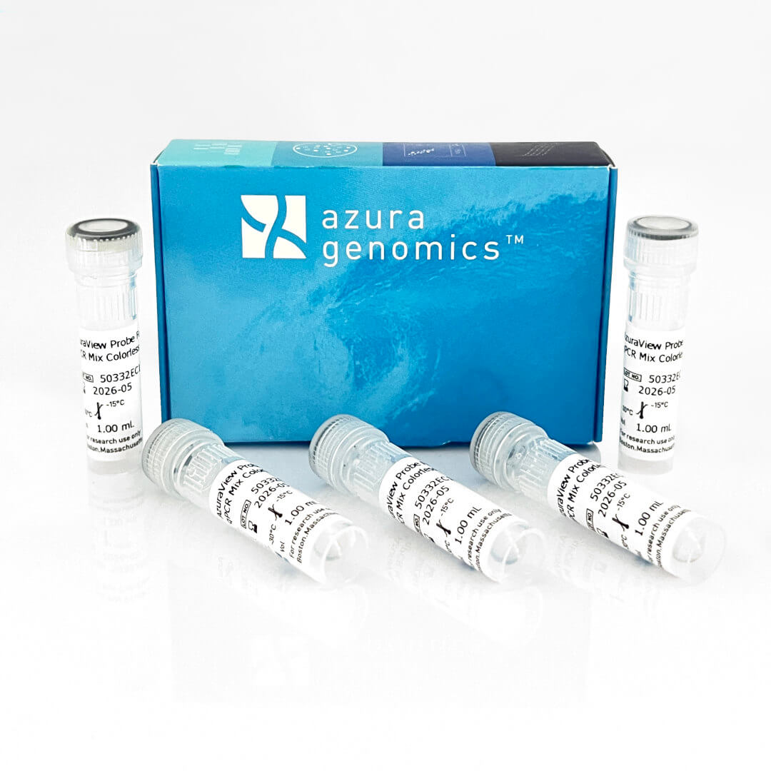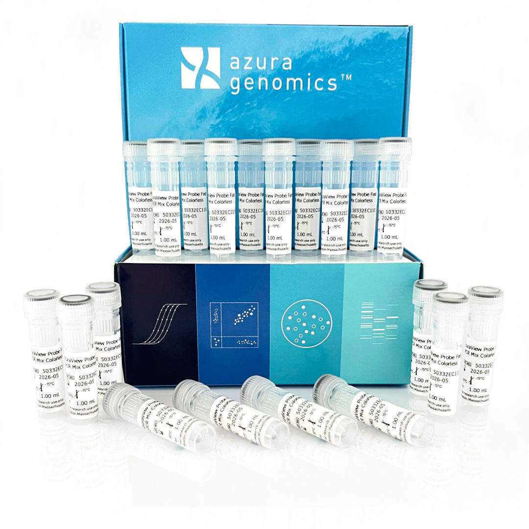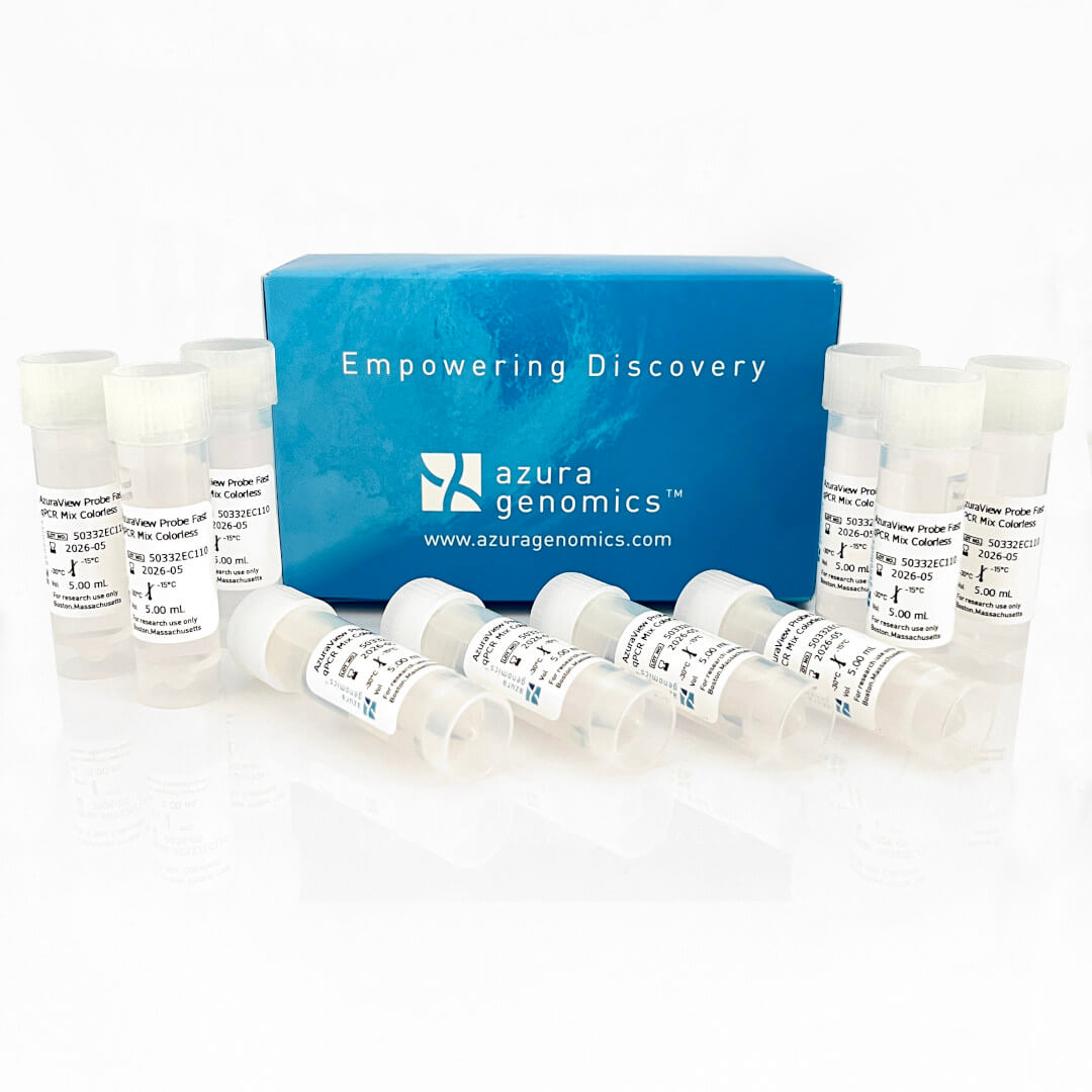 AzuraView™ Probe Fast qPCR Mix Blue reliably quantifies any DNA template including cDNA, genomic DNA, and low copy number viral DNA sequences. The ready-to-use 2x master mix delivers an increased limit of detection with best-in-class sensitivity, and the inert blue dye simplifies reaction setup and reduces pipetting errors. The advanced 2x formulation allows efficient amplification from GC-rich templates and AT-rich templates, as well as resistance to many common PCR inhibitors.