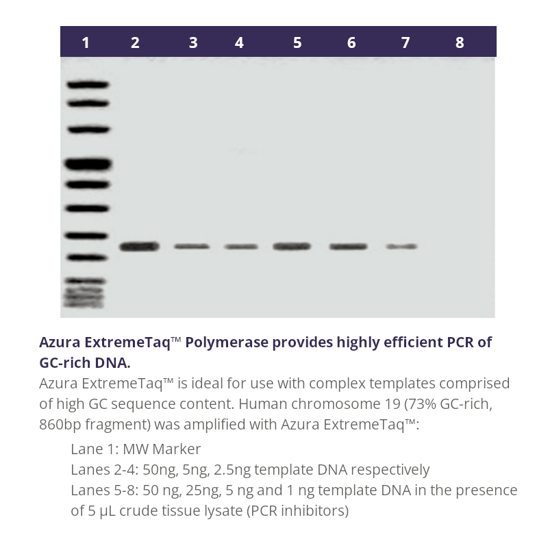 ExtremeTaq™ HiFi Mix is designed and optimized for ease-of-use and broad compatibility with DNA templates of various lengths and complexity, without the need for MgCl2 optimization.