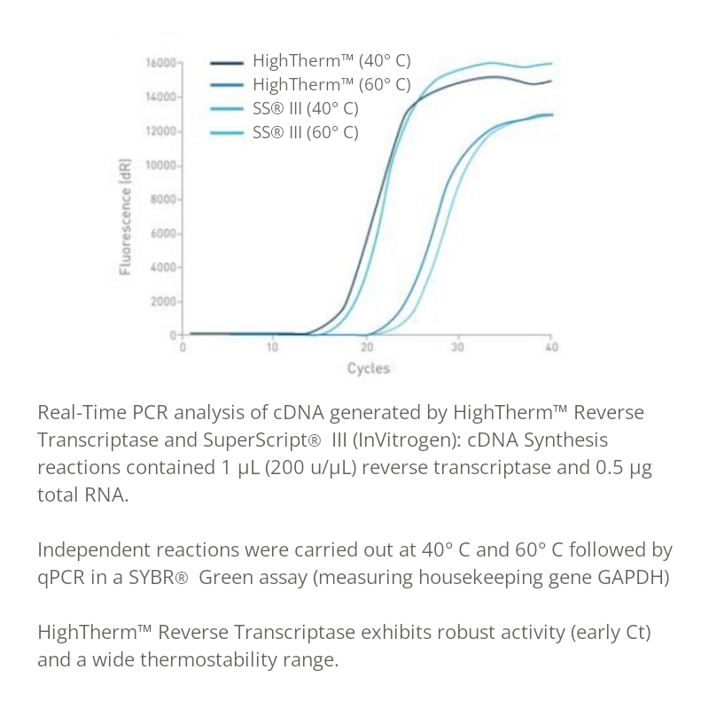 HighTherm™ Reverse Transcriptase efficiently synthesizes a complementary DNA strand from ssRNA, ssDNA or RNA:DNA hybrids with significantly reduced Ribonuclease H activity. HighTherm™ RT generates cDNA from 100 bp to > 12 Kb.