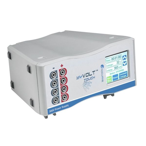 The Accuris myVolt™Touch is a work horse electrophoresis power supply, ideal for efficient separation of nucleic acids and proteins as well as basic western blotting applications. Four pairs of output jacks are wired in parallel for connecting multiple electrophoresis tanks. A color touch screen allows quick setting and monitoring of all run conditions, including run time, voltage, and current. Users can select “Constant Current” or “Constant Voltage” during an electrophoresis run, keeping the chosen parameter fixed as resistance changes. The dual orientation design with rotating display allows the myVolt Touch to be installed in the most convenient location, on a shelf or bench, saving valuable space.