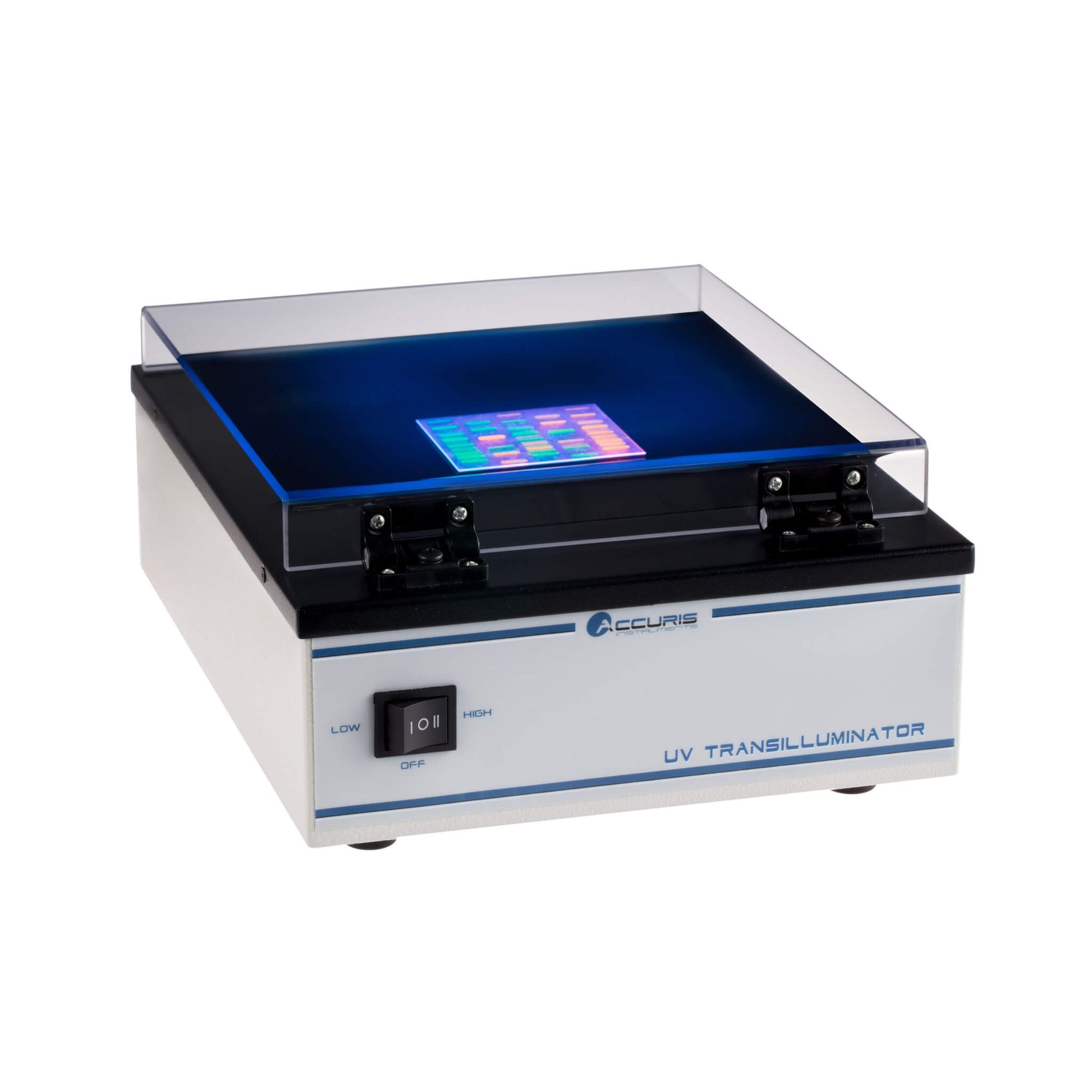 The illuminated surface is comprised of a special black glass which is easy to clean, durable and scratch resistant. An array of 4 high intensity UV bulbs coupled with an optimized filter provides even illumination across the viewing surface and allows detection of small sample quantities. The dual intensity switch can be used to lower the UV intensity to 50% to reduce DNA damage during long exposure times, or switch to high intensity (100%) for viewing weak fluorescent signals or for photo documentation. The acrylic UV blocking cover allows safe viewing of samples and has two friction hinges on the front edge to allow angling of the cover for gel access. The cover can be positioned to 90° (straight up) to fit a gel imaging hood, such as the SmartDoc™ imaging enclosure.